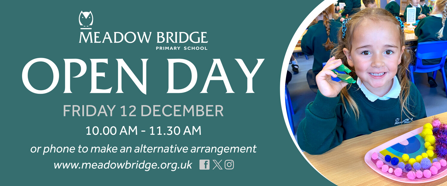 Our Open Day will take place on Friday 12 December from 10.00 am - 11.30 am. We would love to welcome you and your child to school on that morning so you can experience a little of what makes Meadow Bridge such a special place.